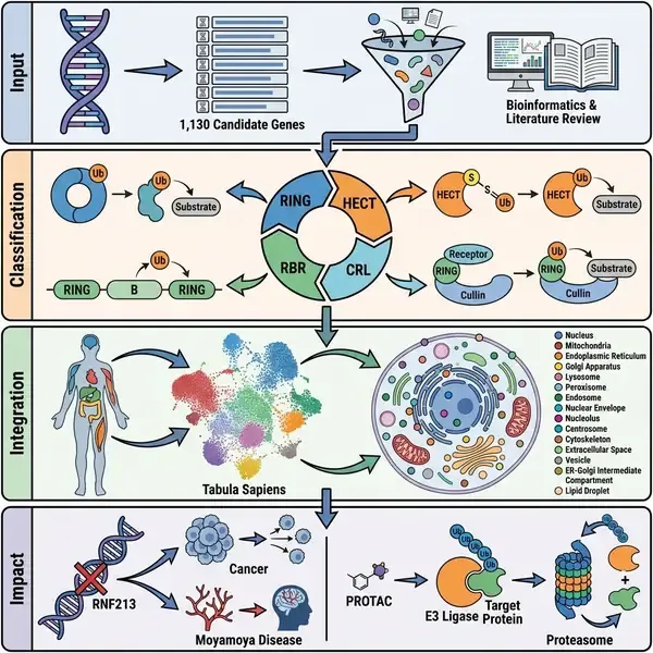 人类泛素系统的架构复杂性长期以来一直受到术语不统一和主导特异性决定因子(即 E3 泛素连接酶)目录不完整的困扰。在一项发表于《Cell》杂志的里程碑式研究中,一个国际研究联盟建立了 “E3-ome”——一个权威的、以基因为中心的人类 E3 连接酶全集,系统地分类并表征了人类 E3 连接酶的景观。通过整合实验生物化学、结构生物信息学和多尺度组学数据,该研究确定了 672 个高置信度 E3 连接酶,为机械生物学和新兴的靶向蛋白质降解领域提供了基础资源。