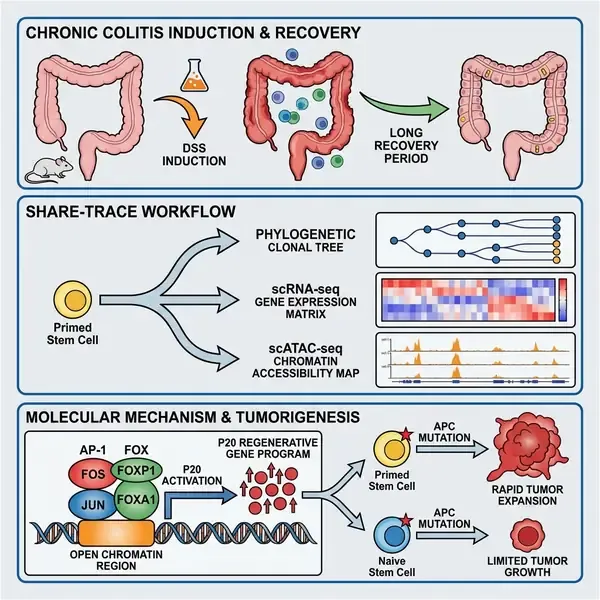 慢性炎症是公认的癌症诱因,但从炎症消退到恶性转化之间的分子桥梁一直未被完全揭示。近日,发表在《自然》(Nature)杂志上的一项研究中,Nagaraja等学者发现结肠干细胞在炎症痊愈后仍保留着持久的“表观遗传记忆”。这种分子层面的“烙印”表现为染色质可及性和转录因子动态的持久改变,在致癌突变发生时,它能显著加速肿瘤的生长。