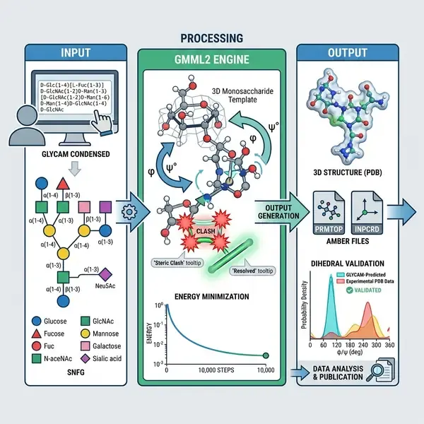 该平台的主要创新之一是其“点选式”界面,该界面利用聚糖符号命名法 (SNFG) 降低了非专家的使用门槛。用户可以从还原端或非还原端构建复杂的分支结构,或从广泛的常见哺乳动物聚糖库中进行选择。为了确保结构的合理性,系统采用“贪婪”算法,通过在实验定义的范围内调整糖苷键二面角来解决空间重叠问题。生成的结构随后使用 GLYCAM 力场进行能量最小化,平台会自动生成在 AMBER 软件套件中进行分子动力学 (MD) 模拟所需的所有输入文件。